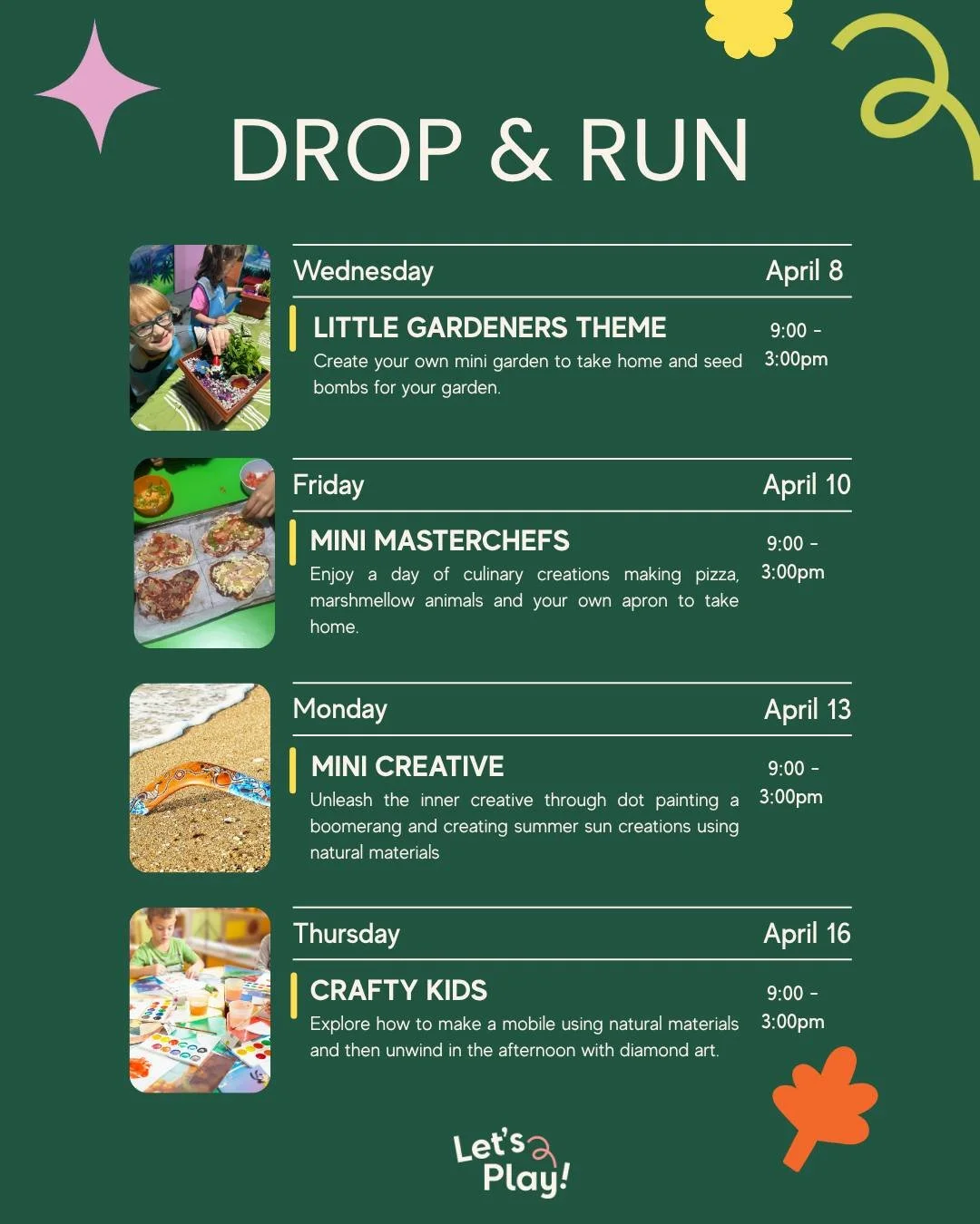 Our Drop & Run School Holiday Program is for children aged 5 - 9 and will on selected days in the Summer school holidays. Each day will feature a new theme, is fully catered and run by our Let’s Play Team Leaders. Join in the fun and allow us to ease the pressure these school holidays!