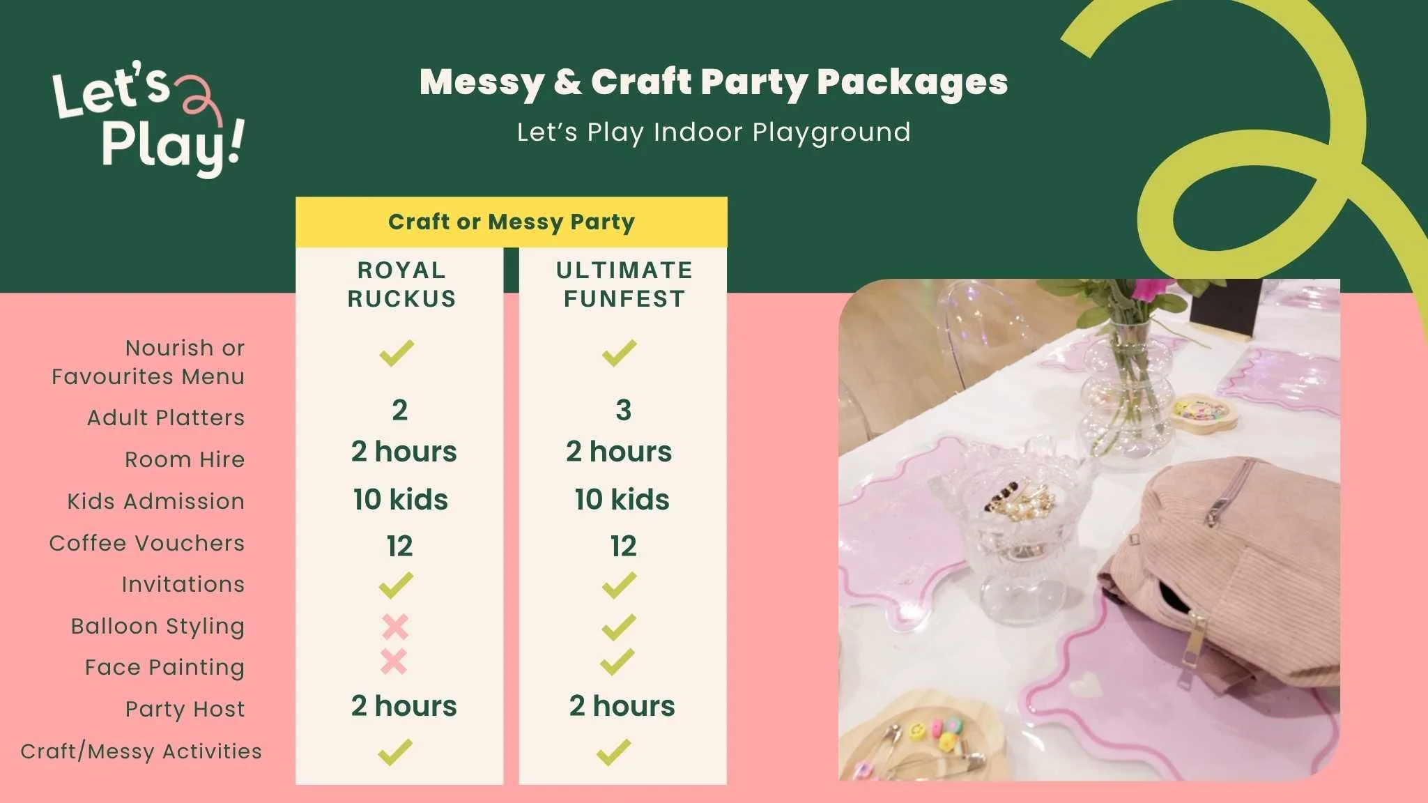 – Choose a messy play theme or one of our trending craft workshop optionsChef-designed party food menu (Favourites or Nourish) for the kids